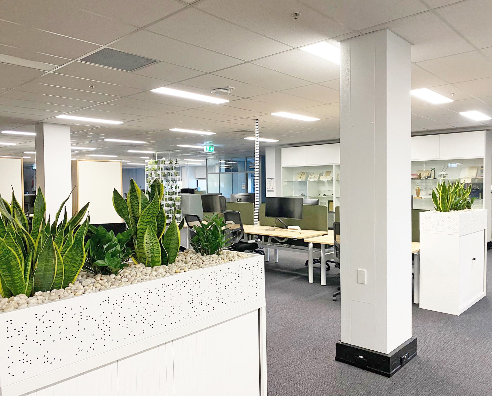 The integrated planting introduces natural softness within the secure workplace while maintaining the professional tone of the environment. Greenery improves acoustic comfort and visual balance while creating a subtle connection to nature for staff. Tropical Plant Rentals also sourced alternative containers that met the design brief while reducing project costs for the client.